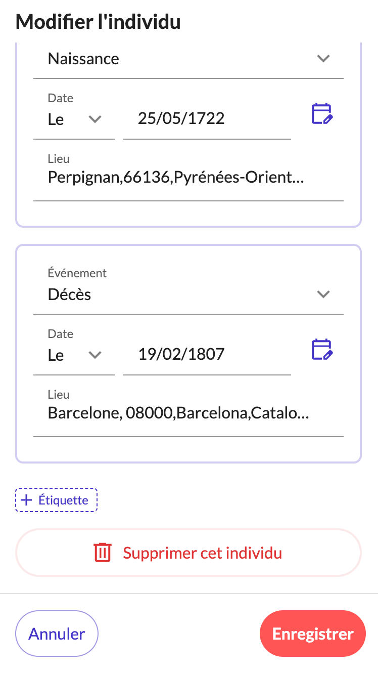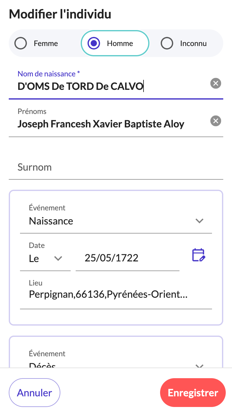 Il faudrait presque prévoir un autre type de formulaire uniquement pour le remplissage sur téléphone avec dans l'ordre - voir exemple de Filae - et y ajouter un bouton "ajouter un autre événement" et en dessous un bouton "ajouter un lien avec une personne"